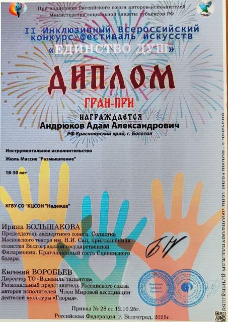 II Инклюзивный Всероссийский конкурс-фестиваль искусств “Единство душ” стал площадкой для демонстрации силы человеческого духа и безграничных возможностей таланта. Адам Андрюков, своим блестящим выступлением и заслуженным Гран-При, вписал яркую страницу в историю этого фестиваля, подарив всем присутствующим незабываемые минуты истинного искусства и вдохновения. Его победа – это триумф таланта, упорства и, конечно же, того самого “единства душ”, которое так прекрасно отражено в названии этого замечательного конкурса.